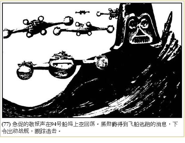 | 急促的警報聲在 94 號船塢上空回蕩。黑武士得到飛船逃跑的消息,下令出動戰艦,跟蹤追查。 |