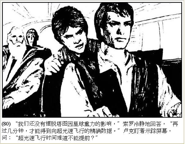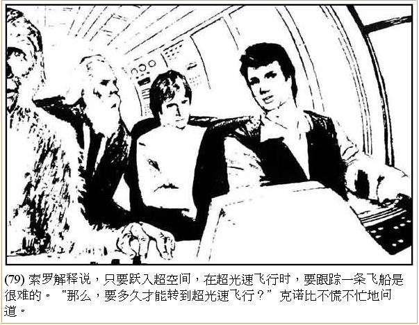 | 韓蘇洛解釋說﹕「只要進入超空間,在超光速飛行時,要跟蹤一條飛船是很難的。」「那麼要多久才能轉到超光速飛行?」肯諾比不慌不忙地問。 |