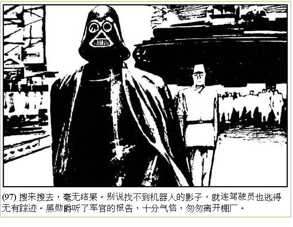 | 搜走搜去,毫無結果。別說找不到機械人的影子,就連駕駛員也逃得無影無蹤。維德聽了軍官的報告,十分氣惱,急忙離開停機棚。 |