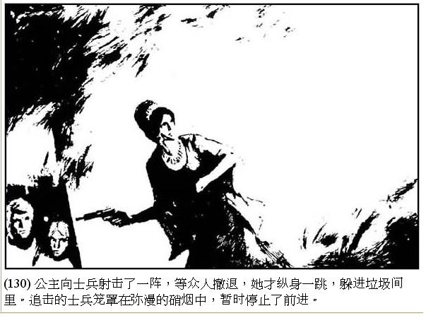 | 公主向士兵射擊了一陣,等眾人撤退,她才縱身一跳,躲進垃圾間裡。追擊的士兵籠罩在彌漫的硝煙中,暫時停止了前進。 |