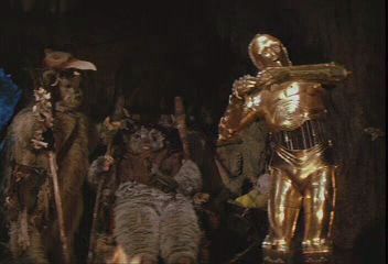 依娃族不從,路克施展原力,令C-3PO坐在椅子上飛起來,