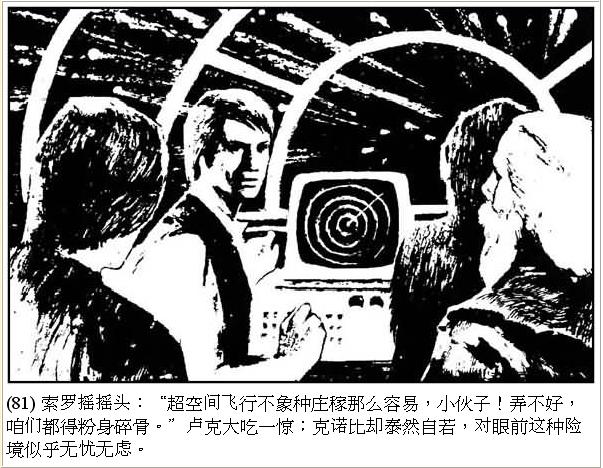 | 韓蘇洛搖搖頭說﹕「超空間飛行不像那麼容易,小伙子!弄不好,我們都得粉身碎骨。」路克大吃一驚;肯諾比卻泰然自若,對眼前這種險境似乎無憂無慮。 |