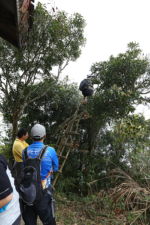 還有個當地人,背了把大獵刀,在涼亭旁袈在樹上的梯子登高望遠...