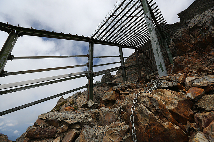 除了怕落石,也怕登山客直接一頭撞上下凹的鐵籠橫樑