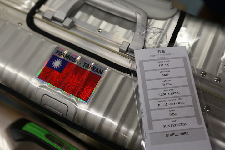 照片中紅色的繫條,就是綁在行李箱上用的,以方便行李下船後分區擺放,以利領取